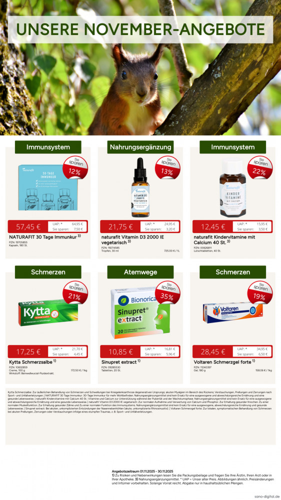 Zu Risiken und Nebenwirkungen lesen Sie die Packungsbeilage oder fragen Sie Ihren Arzt oder Apotheker. Alle November-Angebote gültig bis einschließlich 30.11.2025. Hinweis: Für rezeptpflichtige Arzneimittel gilt die gesetzliche Preisbindung. Alle Artikel nur solange Vorrat reicht. Abgabe von Arzneimitteln nur in therapieüblichen Mengen. Arzneimittel müssen daher unbedingt in der therapeutischen Dosierung angewandt werden. Preisänderungen vorbehalten.