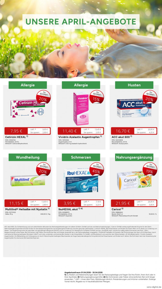 Zu Risiken und Nebenwirkungen lesen Sie die Packungsbeilage oder fragen Sie Ihren Arzt oder Apotheker. Alle April-Angebote gültig bis einschließlich 30.04.2026. Hinweis: Für rezeptpflichtige Arzneimittel gilt die gesetzliche Preisbindung. Alle Artikel nur solange Vorrat reicht. Abgabe von Arzneimitteln nur in therapieüblichen Mengen. Arzneimittel müssen daher unbedingt in der therapeutischen Dosierung angewandt werden. Preisänderungen vorbehalten.